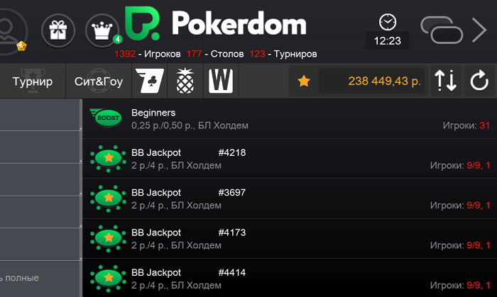 - наличие фильтров – они предназначены для сортировки турниров и кеш-столов по необходимым параметрам для быстрого поиска подходящих игр;